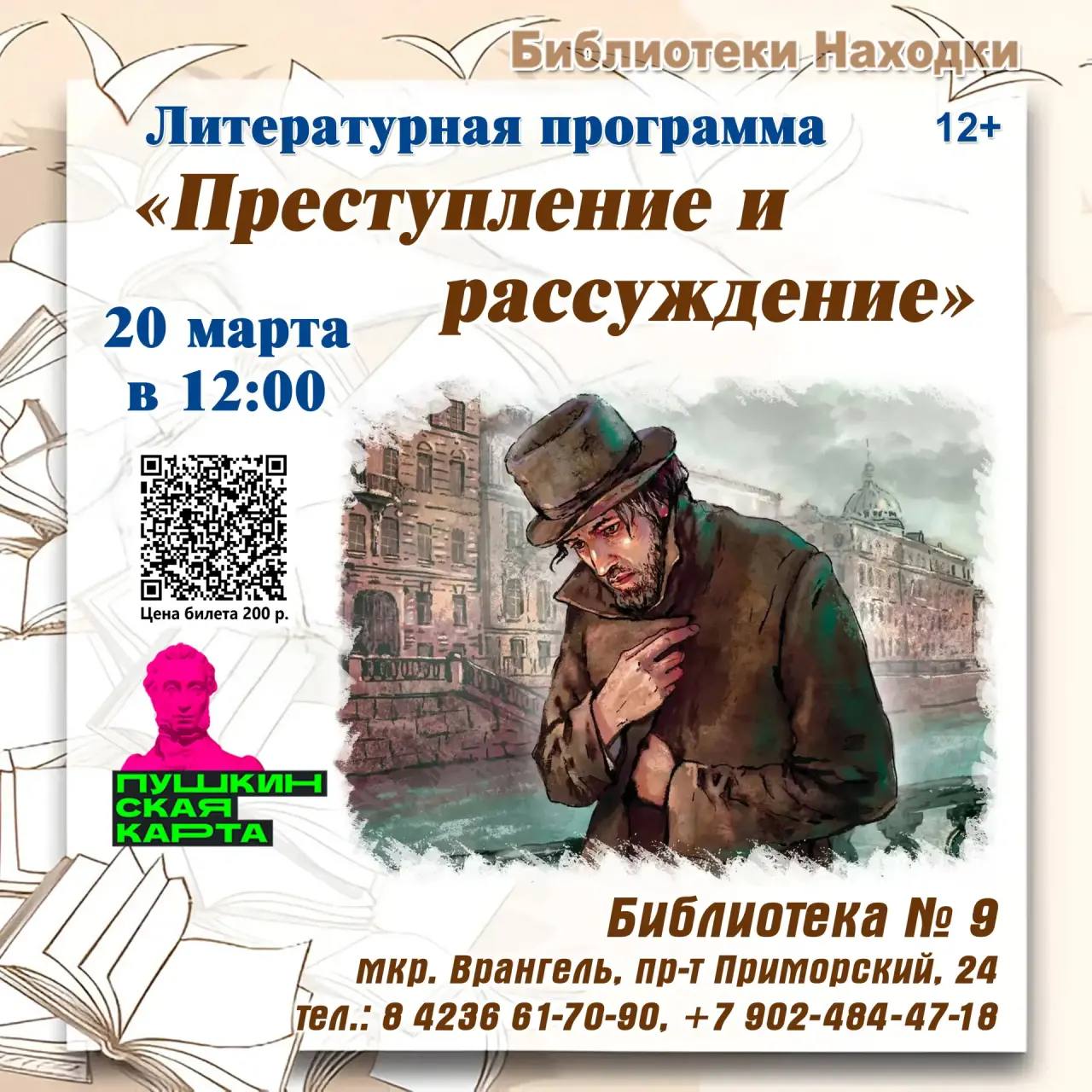 Литературная программа «Преступление и рассуждение», посвященная роману Ф.М. Достоевского, состоится в библиотеке № 9.