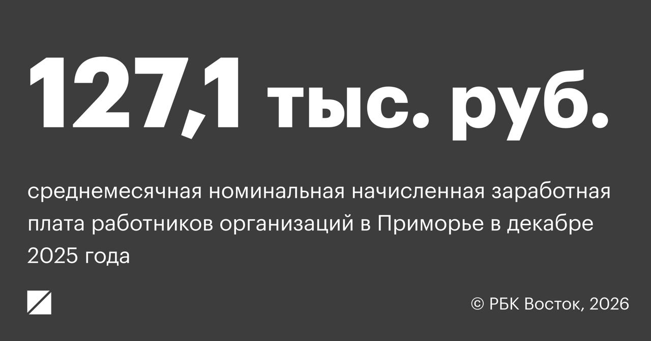 В декабре 2025 года среднемесячная номинальная начисленная заработная плата работников организаций в Приморье составила 127,1 тыс. руб.