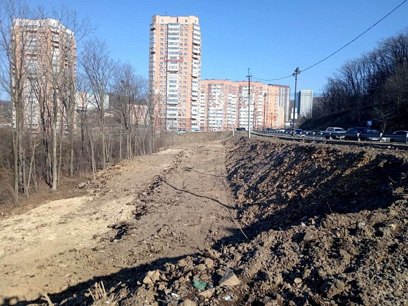 Со стороны улицы Анны Щетининой дорожники приступили к устройству насыпи из скального грунта, параллельно идёт демонтаж существующего тротуара. Со стороны Выселковой стартовали работы по разработке грунта для дальнейшего возведения подпорной стены.