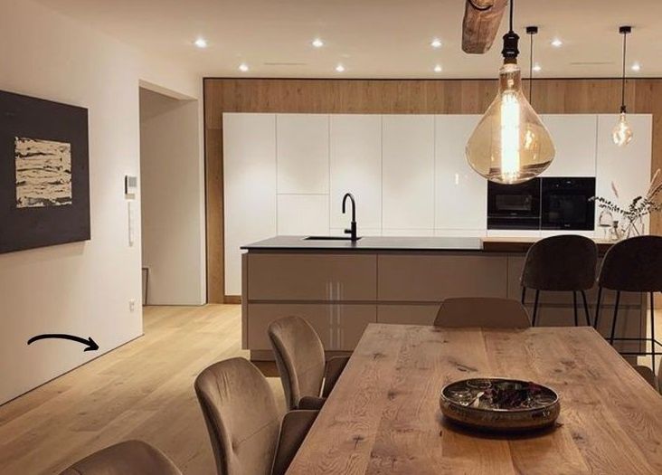 - Выбор пола: для достижения эффекта единого конттура предпочтительно выбирать клеевые полы, которые укладываются без зазоров. Плавающие полы, со своей стороны, требуют Г-образного профиля для закрытия технического зазора.