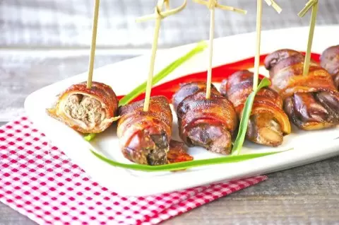 Готовые румаки можно подавать на стол, воткнув шпажки в каждый кусочек. Несмотря на то, что на фото закуска может выглядеть несколько поджаристой, внутри она останется сочной благодаря бекону.