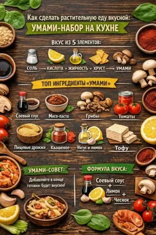 Ключевые позиции включают: соевый соус, мисо-пасту, томатную пасту или пассату, грибы, ферментированные продукты, пищевые дрожжи, копчёные специи, кислоты и соевые заправки. Тofu служит базой вкуса и текстуры, позволяя блюдами быть полноценными.