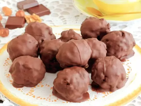 Необыкновенно простое угощение: всего четыре ингредиента – орехи, яичный белок, мёд и шоколад. Эти конфеты можно приготовить без форм и специальной техники, используя лишь ложку и руки. Такое лакомство станет отличным способом переработать запасы орехов, которые забылись на полке.