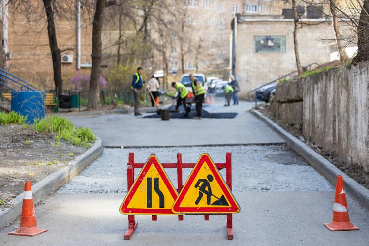 На Народном проспекте, 19 во Владивостоке ведутся работы по укладке нового асфальта. Зимой на этом участке произошло технологическое повреждение, которое было оперативно устранено. Однако низкие температуры не позволили сразу провести полноценное восстановление дорожного полотна.