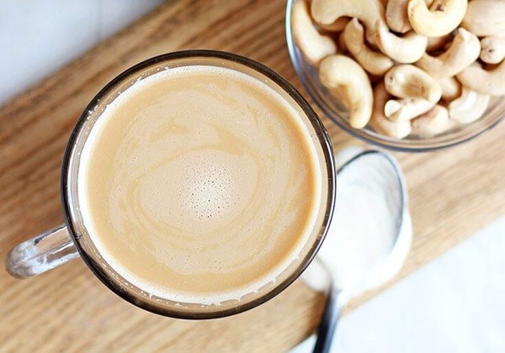- Латте с кешью: Для начала нужно сделать кешьюмолоко, смешав 30-50 г кешью с 200 мл воды. Размешать в блендере до однородной массы и процедить. Затем добавьте эспрессо и немного мёда для сладости.
