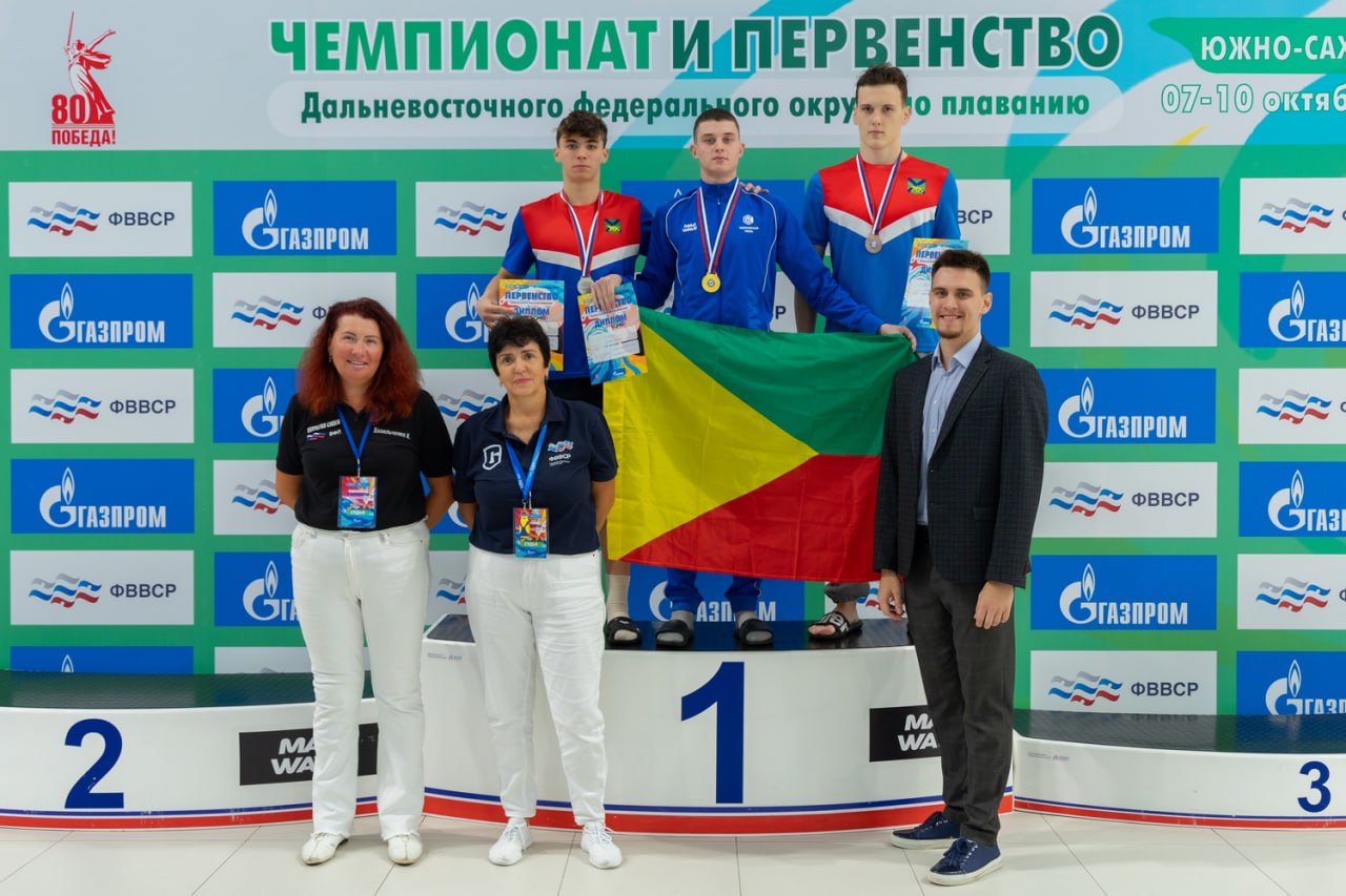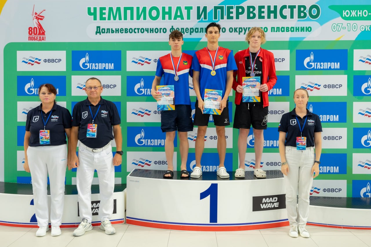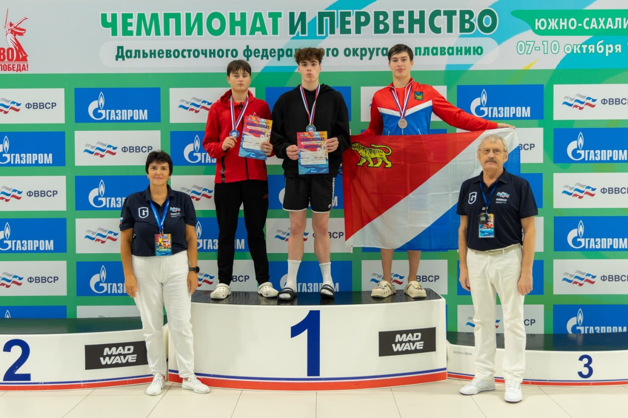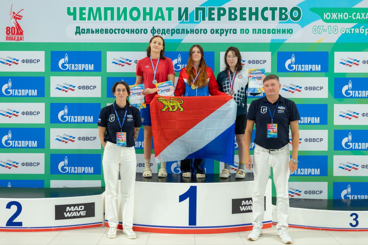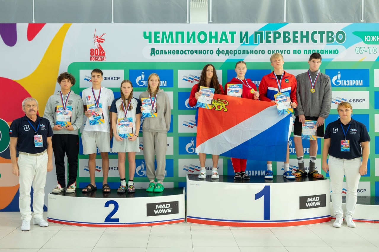 Сборная Приморского края одержала уверенную победу в медальном зачёте чемпионата и первенства Дальнего Востока по плаванию, прошедших в Южно-Сахалинске. На счету команды – 128 наград, из них 41 медаль в чемпионате и 87 в первенстве округа. Ближайшие соперники из Хабаровского края набрали 94 медали.
