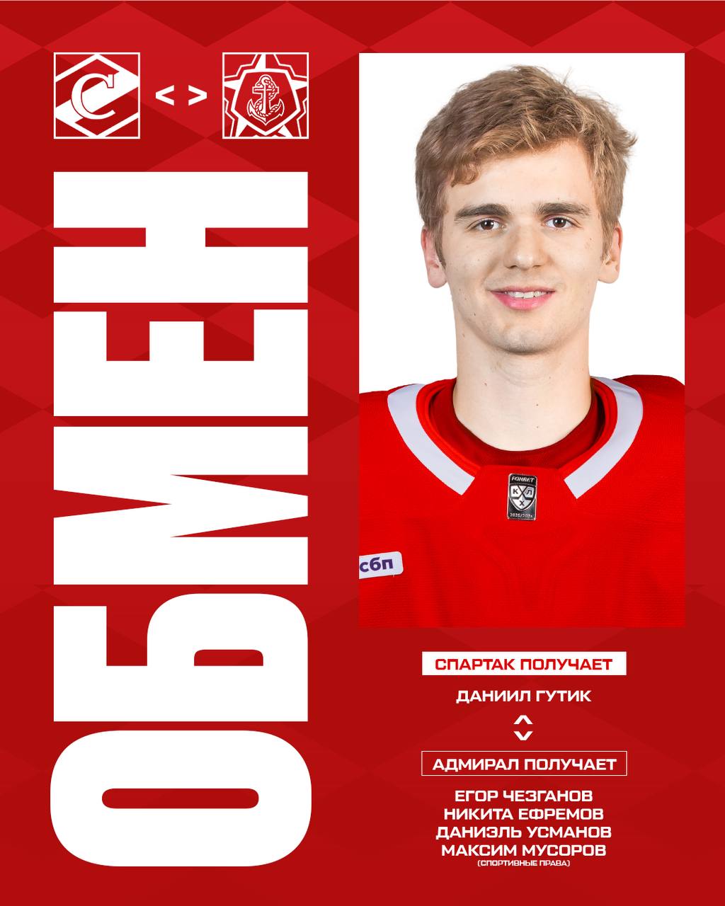 «Спартак» расстался с тремя игроками, чтобы приобрести нового хоккеиста. Защита клуба потеряла Никиту Ефремова, а нападение — Егора Чезганова и Даниэля Усманова. Кроме того, «Спартак» уступил «Адмиралу» права на Максима Мусорова.